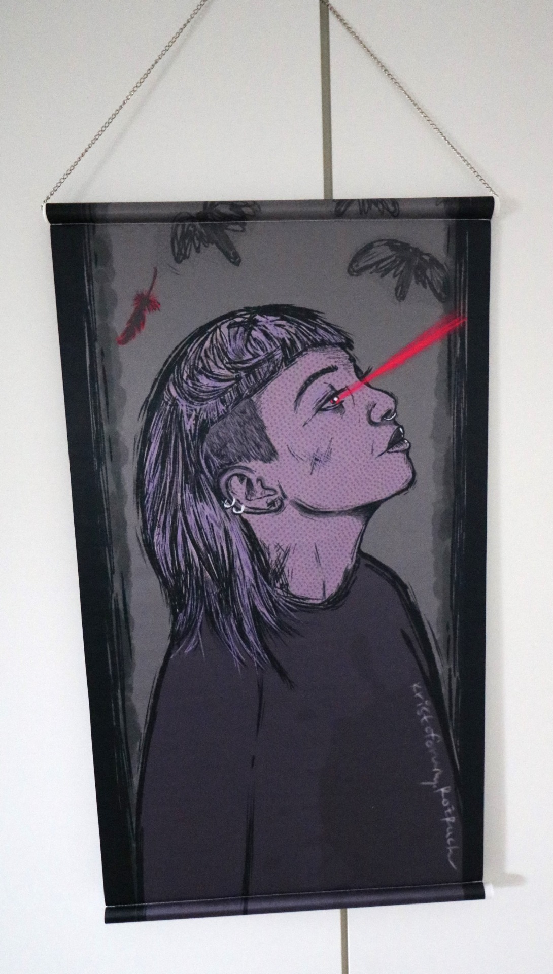rám obšitý látkou s plastovými konci a řetízkem pro zavěšení (viz detail v galerii produktu)